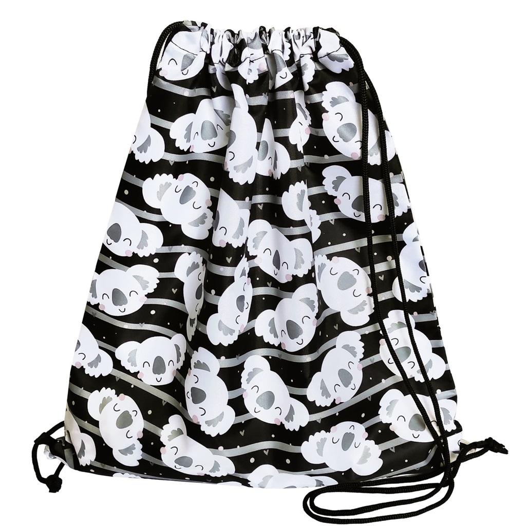 Opis produktuZasady bezpieczeństwaWorek szkolny na obuwie zmienne z możliwością założenia na plecy ( wzór: pyszczki misiów koala na czarnym tle w białe, cienkie pasy). Wymiar 35xh40cm.