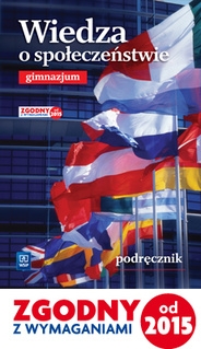 Zalety podręcznika Wiedza o społeczeństwie. Gimnazjum Wygodny - jeden podręcznik na 60 godzin nauki, treści uporządkowane od tematyki łatwiejszej (grupy społeczne, życie szkoły itp.) do trudniejszej (sytuacja międzynarodowa, życie gospodarcze). Ciekawy - aktualne treści polityczne, społeczne i ekonomiczne, polecenia i prace projektowe skłaniające do dyskusji o problemach lokalnych i globalnych oraz angażowania się w działania w ramach społeczeństwa obywatelskiego. Przyjazny - przystępna narracja, atrakcyjna szata graficzna grafika, liczne fotografie, rysunki satyryczne, mapy, infografiki i wykresy. Skuteczny - różnorodne pytania i polecenia sprawdzające wiedzę i umiejętności, podsumowania lekcji ułatwiające powtarzanie materiału przed sprawdzianami i egzaminem.Podręcznik jest przystosowany do nowych wymagań MEN obowiązujących w gimnazjum od września 2015 r.