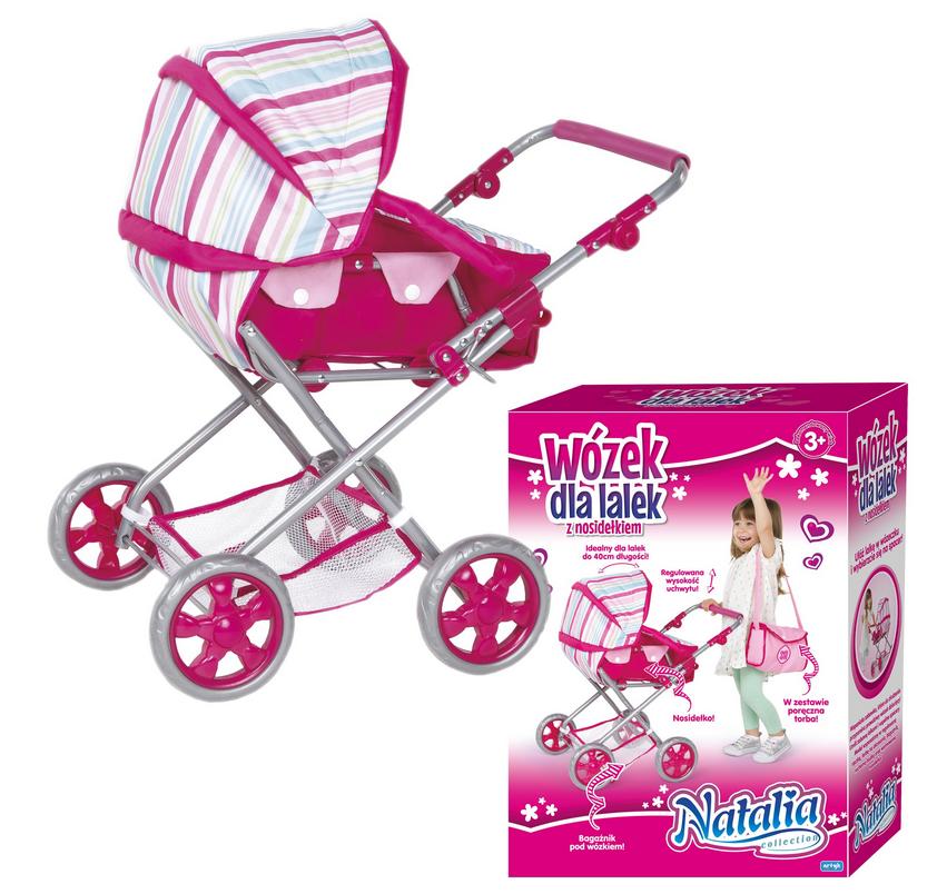 Wspaniały głęboki wózek dla lalek (maksymalna długość lalki 40 cm) z regulowaną rączką, poręczną torbą, oraz nosidełkiem w zestawie. Przyda się każdej dziewczynce wcielającej się w rolę mamy! x