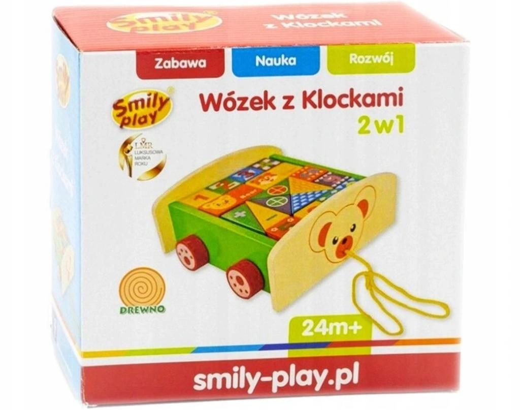 Wózek z Klockami inspiruje maluchy do aktywnej zabawy. Zestaw składa się z 18 klocków o różnych kształtach i kolorach. Na klockach namalowane są cyferki od 1 do 10, wizerunki zwierząt i różnorodne wzory. Wózek ma kółka i sznureczek do ciągnięcia. Dziecko, które opanowało zdolność samodzielnego chodzenia może zabrać zabawkę na spacer.