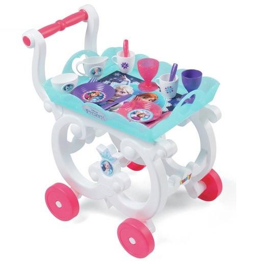 Uroczy wózeczek z praktyczną rączką i zdejmowaną tacą, z 13 akcesoriami, w tym imitacje ciasteczek, kubeczki, łyżeczki i talerzyki.