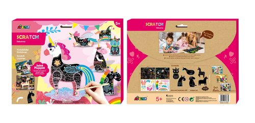 Avenir Scratch to zupełnie nowe podejście do prac ręcznych. Wyjątkowy arkusz, na którym tworzy się poprzez zdrapywanie warstwy wierzchniej, by odsłonić wielobarwną warstwę spodnią. Zestaw Jednorożce pozwala na stworzenie ruszających się papierowych laleczek jednorożców, którymi dziewczynka może się bawić.