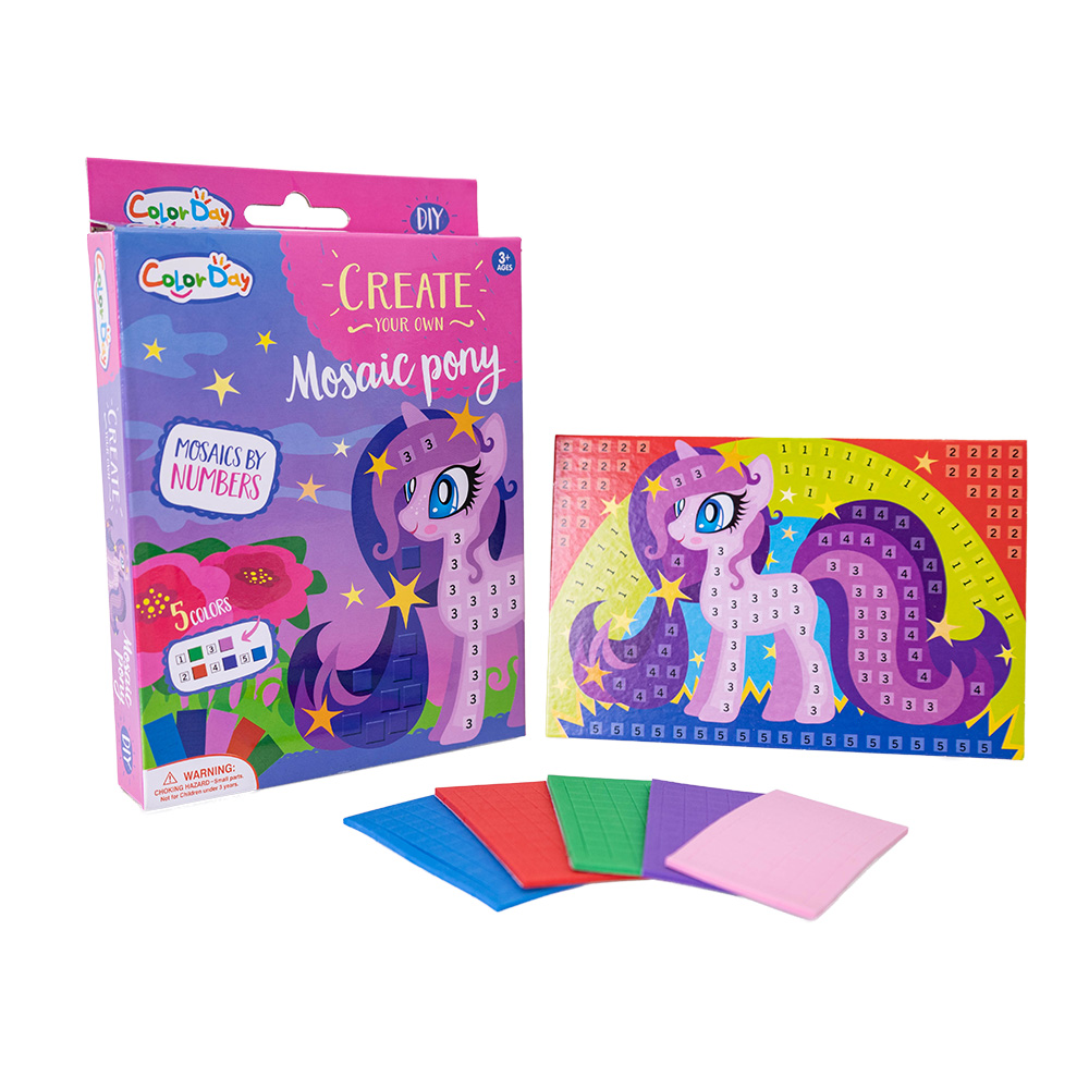 Mozaika z numerkami, na które dziecko przykleja kolorowe naklejki w odpowiedni kwadracik.