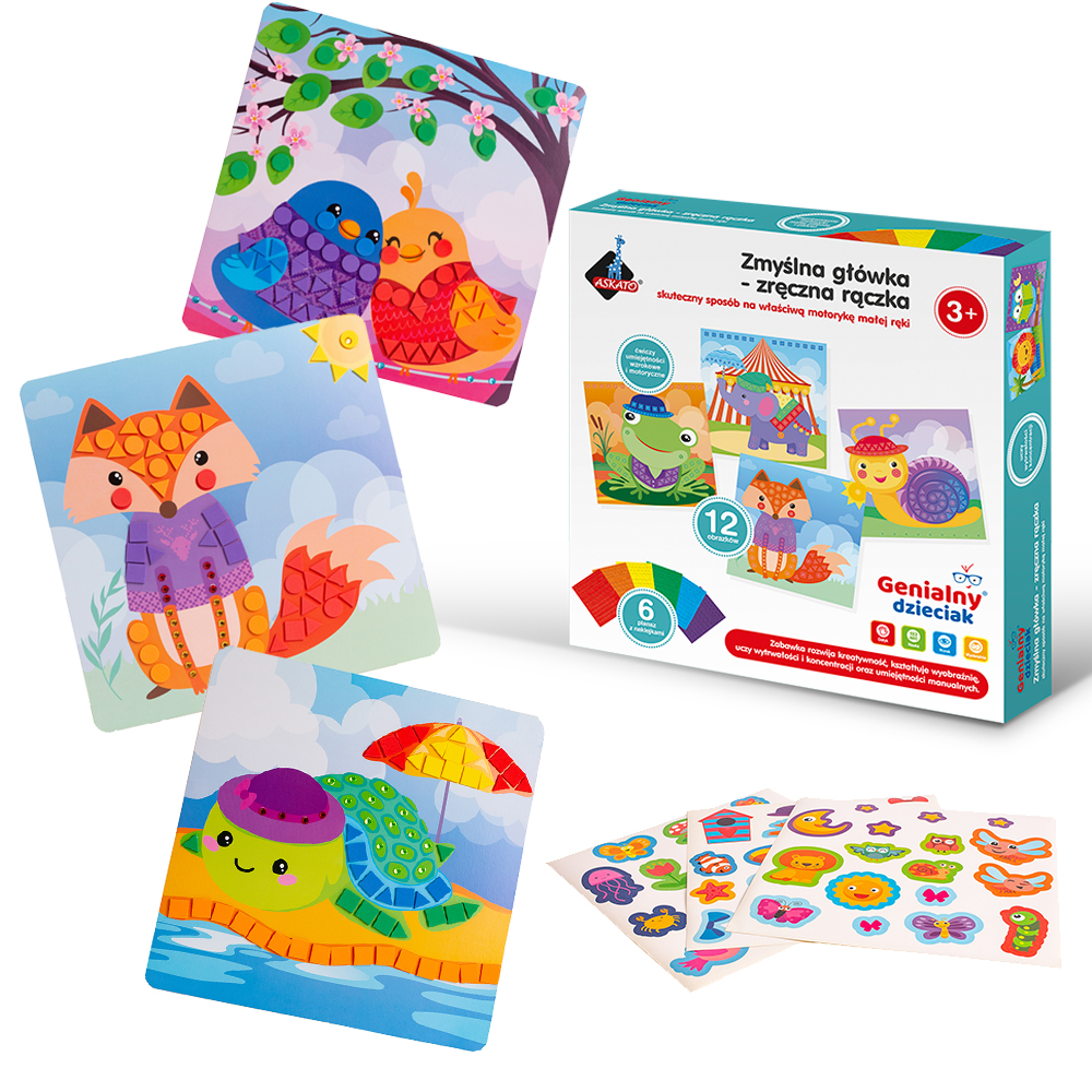 Opis produktuZasady bezpieczeństwaKolorowe obrazki zwierzątek do ozdobienia. Wyklejanka z ponad 700 elementami do wyklejania - kółeczka, kwadraciki i trójkąciki w różnych kolorach oraz 250 błyszczących dżetów. W zestawie także 50 kolorowych naklejek. W zestawie 12 obrazków. Wiek: 3+ Wymiary obrazeka: 24.5x24.5 cm Wymiary opakowania: 27x5x26.5 cm x