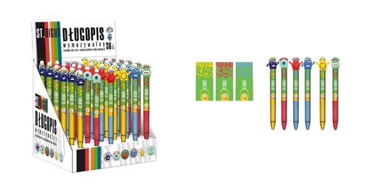 Wymazywalny niebieski tusz, cienka końcówka pisząca 0,5 mm umożliwiająca precyzyjne pisanie. Anatomicznie profilowany gumowy, antypoślizgowy grip zapewniający komfortowy chwyt i wygodne prowadzenie długopisu po kartce. Specjalna końcówka ścierająca w połączeniu ze specjalistycznym tuszem umożliwia łatwe wymazywanie napisanego tekstu, czy skorygowanie błędu. Gadżeciarski charakter długopisu sprawia, że pisanie jest nie tylko nauką, ale dobrą zabawą i czystą przyjemnością. x