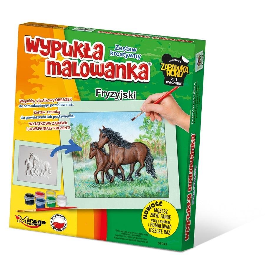 Opis produktuZasady bezpieczeństwaWypukła Malowanka od Mirage Hobby to Zestaw Kreatywny do malowania dla osób powyżej 5. roku życia. Zestaw zawiera wypukły, plastikowy, kształtny obrazek 3D, farbki akrylowe, pędzelek oraz ramkę z kartonu do postawienia lub powieszenia. Zmyj obrazek przy użyciu ciepłej wody, mydła i szczoteczki, najpóźniej do 15 min. po pomalowaniu. Obrazek ma odpowiedni do wzoru wypukły kształt 3D, który jest dobrze odczuwalny w dotyku. Produkt jest wymyślony i wyprodukowany w Polsce! Wszelkie prawa zastrzeżone. Każda Wypukła Malowanka to konkretny wzór z danej serii. Kolekcja jest podzielona na różne serie np. Koty, Psy, Konie, Futrzaki, Dinozaury, Jednorożce, Kwiaty, Sport, Bajki, Zoo, Las, Taniec i inne. Seria Wypukła Malowanka Zestaw Kreatywny została nagrodzona Wyróżnieniem Zabawka Roku 2018. x