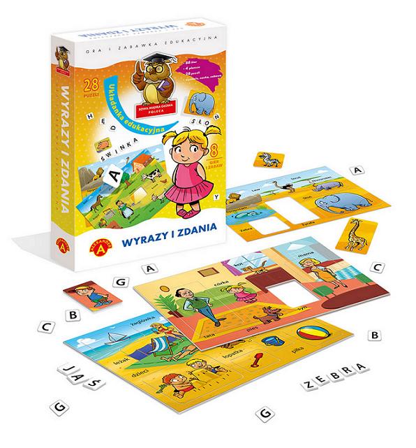 "Wyrazy i zdania" to świetna zabawa i jednocześnie pomoc dydaktyczna dla dzieci w wieku przedszkolnym. W pudełku znajdują się 4 plansze przedstawiające różne scenki tematyczne. Dzieci podczas zabawy wyciągają z planszy bohaterów obrazka i układają z liter pasujące do nich wyrazy - podpisy. W zależności od umiejętności mogą robić to samodzielnie lub korzystając z podanego na planszy wzoru. To świetny sposób na stopniową naukę rozpoznawania i zapamiętywania liter, układania wyrazów i zdań. Inne warianty gier i zabaw rozwijają spostrzegawczość, koncentrację oraz umiejętność czytania. Zawartość pudełka: 4 plansze, 88 liter, instrukcja.