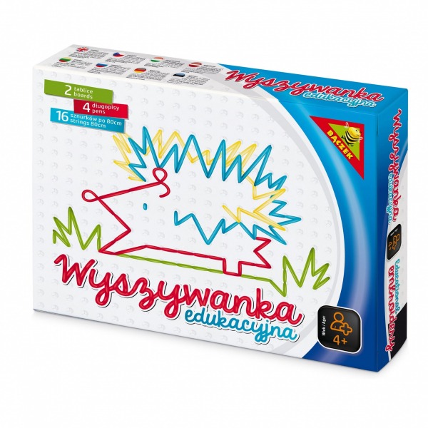 Opis produktuZasady bezpieczeństwaWyszywanka edukacyjna to doskonała zabawka, która wyrabia zdolności manualne małych rączek. W zestawie znajduje się wszystko co niezbędne do rozpoczęcia przygody z wyszywaniem: 2 plansze, 4 długopisy i 16 sznurków. Aby powstał obrazek należy zacząć od nawleczenia sznurówką plastikowego długopisu. Następnie wystarczy wcisnąć długopis z nawleczoną sznurówką w samoblokujący się otworek w planszy, który utrzyma w odpowiednim ułożeniu cały obrazek. Taka twórcza forma zabawy wpłynie pozytywnie na rozwój wyobraźni i koncentrację. Wyszywanka pozwala dzieciom na swobodę w tworzeniu. Maluch może tworzyć wszystko co podpowie mu wyobraźnia. To przygoda, która nigdy się nie kończy! x