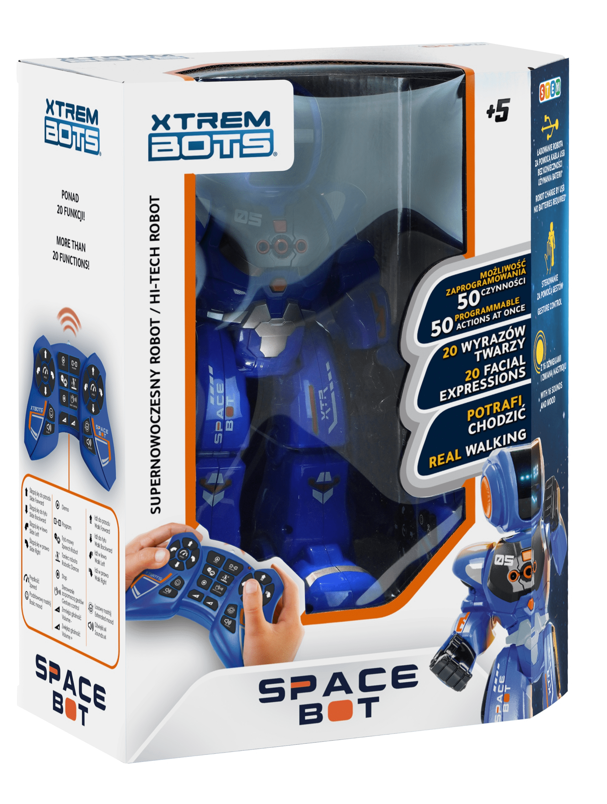 Space Bot to naprawdę dużoooo zabawy, ze względu na ilości funkcji oraz możliwość programowania aż do 50 różnych działań! Zabawka została wyposażona w inteligentne sterowanie gestami, a także tryb tańca! Ponadto wydaje z siebie dźwięki, które pozwolą zanurzyć się Twojemu dziecku w zabawę pełną sensoryki. Zapewnij dziecku kreatywny sposób spędzania wolnego czasu w pojedynkę lub z przyjaciółmi. Zbierz wszystkiego roboty z serii, aby stworzyć futurystyczną kolekcję! Rozwijaj umiejętności programowania, podstaw inżynierii i robotyki w ciekawy i atrakcyjny sposób. Zaprogramuj do 50 działań Kontrola gestów Programowanie Język robotów Światło i dźwięk 20 wyrazów twarzy Tryb tańca 4 kierunki poruszania się, w dwóch trybach Regulacja głośności Regulacja prędkości Funkcja demo x