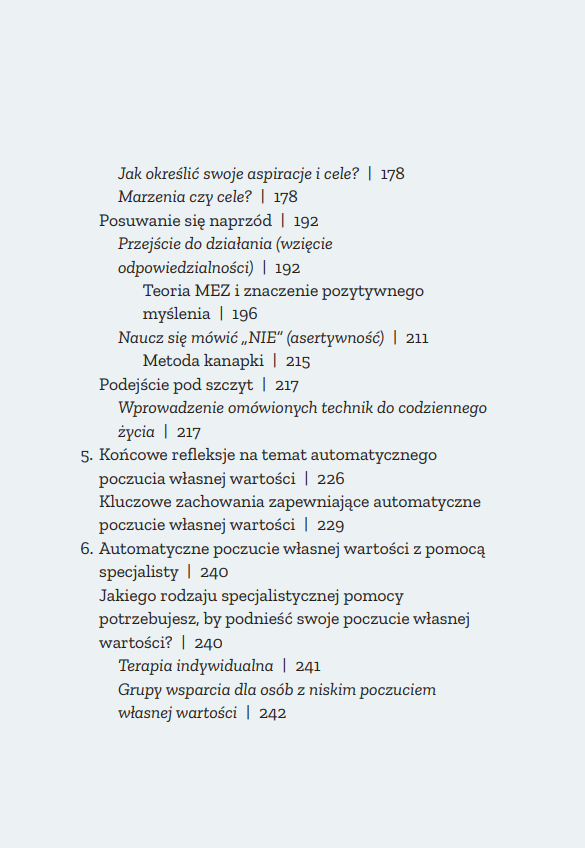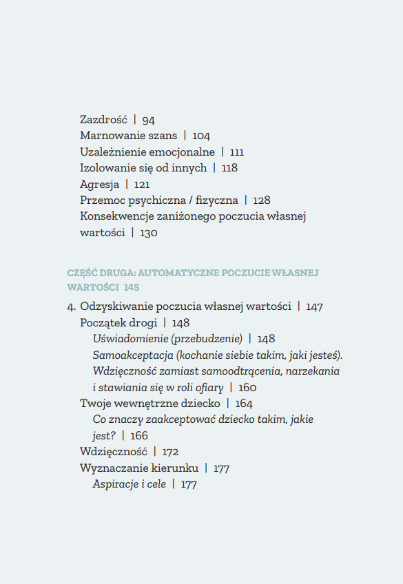 Opis produktuZasady bezpieczeństwaBESTSELLEROWY PORADNIK GURU ZDROWYCH RELACJI Uważasz, że nie zasługujesz na miłość i szczęście? Rezygnujesz z czegoś, na czym ci zależy, bo z góry zakładasz, że ci się nie uda? A może masz problem ze stawianiem granic? Jeśli boisz się odrzucenia, stale porównujesz się z innymi i potrzebujesz aprobaty z zewnątrz, żeby poczuć się lepiej - czas zaakceptować siebie. Odważ się wyjść ze swojej skorupy i pokazać światu, jaka naprawdę jesteś! Przed tobą pierwszy krok do trwałej zmiany i podwyższenia samooceny. Z tym poradnikiem nauczysz się, jak zadbać o swoje wewnętrzne dziecko, odrzucić błędne przekonania o sobie oraz wzmocnić poczucie własnej wartości i w pełni siebie docenić. "Zaakceptuj siebie. Jak zaprzyjaźnić się ze sobą i docenić swoją wartość"to książka kompas, która wskaże Ci kierunek w złożonym procesie budowania wysokiej samooceny, a także tworzeniu zdrowych przekonań o sobie, stawianiu granic, uciszaniu wewnętrznego krytyka i dbaniu o swoje wewnętrzne dziecko. To praktyczny poradnik o wzmacnianiu poczucia własnej wartości, dzięki któremu zostaniesz swoją najlepszą przyjaciółką i zaczniesz traktować siebie z czułością, wyrozumiałością i miłością. "Zaakceptuj siebie" to książka nie tylko dla fanów poradników Stefanie Stahl i Alexandry Reinwarth, ale również dla każdego, kto wątpi w siebie i swoje możliwości, nie docenia własnych osiągnięć i ze strachu przed porażką chowa się w swojej strefie komfortu. Zostań swoją najlepszą przyjaciółką! "Zaakceptuj siebie" rozbija poczucie własnej wartości/samo-ocenę na czynniki pierwsze i pokazuje, co możemy zrobić, aby nasze życie zyskało nową jakość. Ten poradnik wprowadzi cię w zupełnie nowy wymiar dbania o siebie. Marta Niedźwiecka AUTORKA BESTSELLERA Pokochaj siebie. Jak zbudować dobrą relację z samą sobą Silvia Congost jest ekspertką od zdrowych relacji, psycholożką specjalizującą się w obszarach samooceny, zależności emocjonalnej i konfliktów w związkach. Z uwagi na własne doświadczenia - udało jej się uwolnić z toksycznej relacji - z zaangażowaniem pomaga innym w zrywaniu więzi z destrukcyjnymi osobami oraz w budowaniu poczucia własnej wartości i uczy, jak tworzyć zdrowe związki. Jest autorką dziewięciu bestsellerowych poradników, a jej poradom zaufały już tysiące czytelniczek. Recenzje:✖ Opinia niepotwierdzona zakupem