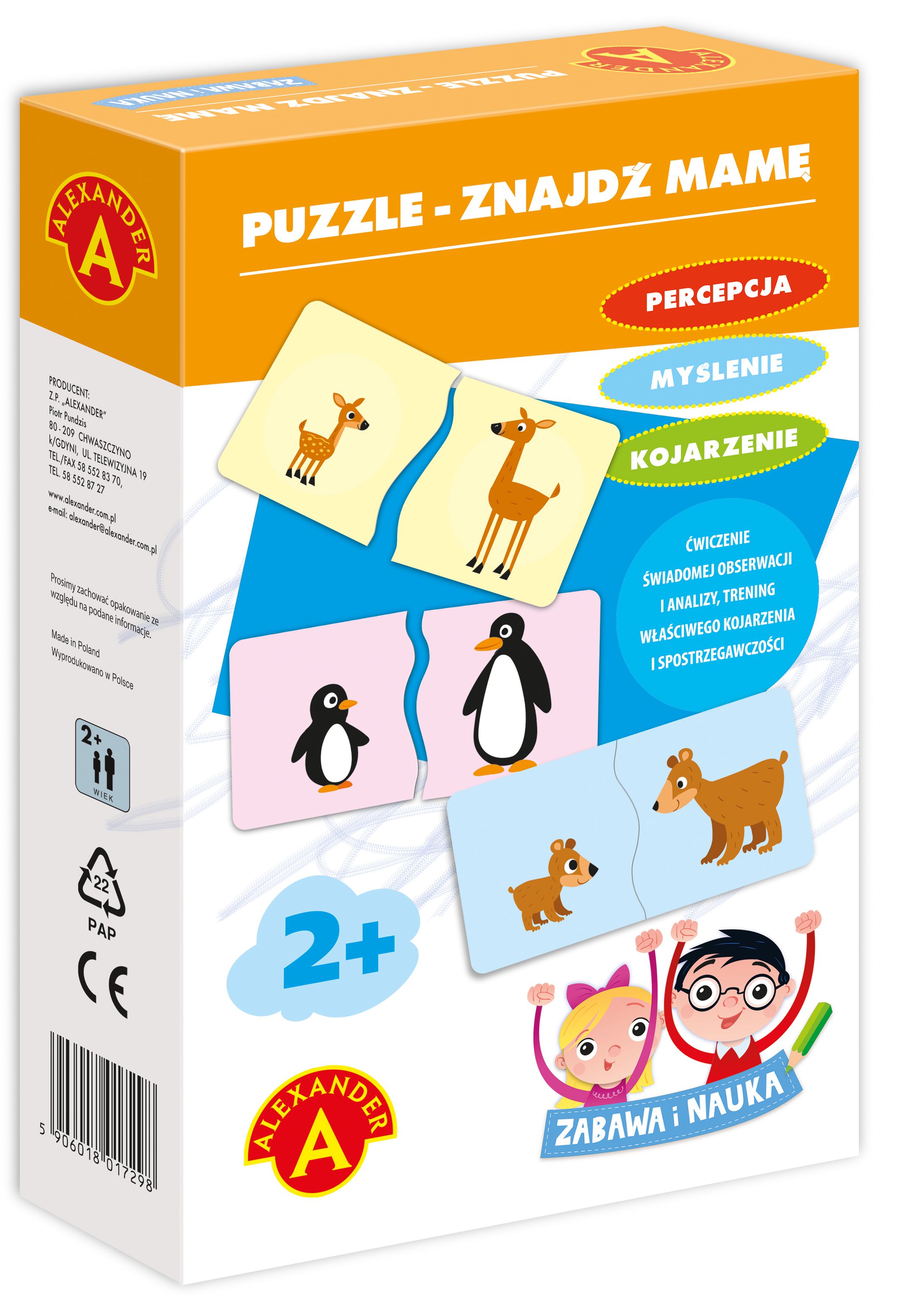 Opis produktuZasady bezpieczeństwaZabawka dla najmłodszych bazująca na podstawowej i najważniejszej relacji społecznej jaką dla maluszka jest więź z mamą. Zadanie polega na połączeniu ze sobą w pary puzzla z małym zwierzątkiem oraz puzzla przedstawiającego jego mamę. Zabawa jest doskonałym pretekstem do ćwiczenia wymowy nazw zwierząt oraz tworzenia ich odmian i zdrobnień. Zawartość opakowania