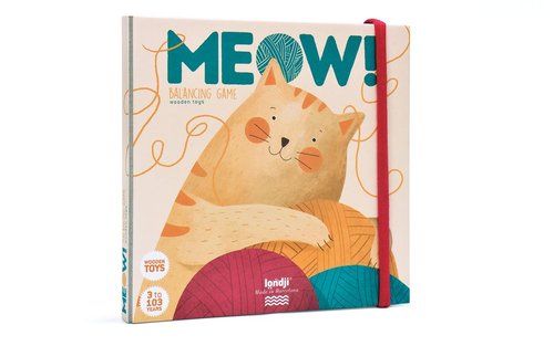 Drewniana zabawka dla dzieci z postacią sympatycznego kotka, który bawi się kolorowymi motkami. Kotek się lekko kołysze utrudniając ułożenie wszystkich, okrągłych klocków na jego brzuszku.