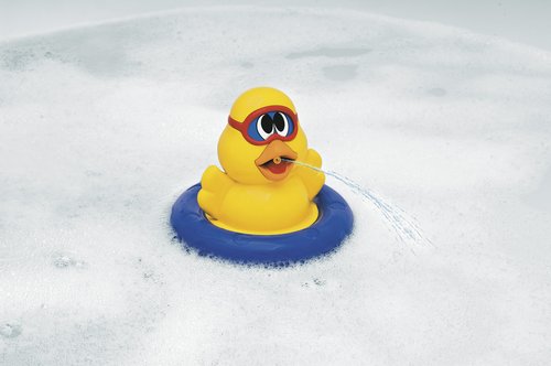 Nakręć płetwy kaczuszki i obserwuj jak zabawnie obraca się w wodzie. Naciśnij przycisk na plecach kaczki, żeby pryskała wodą.