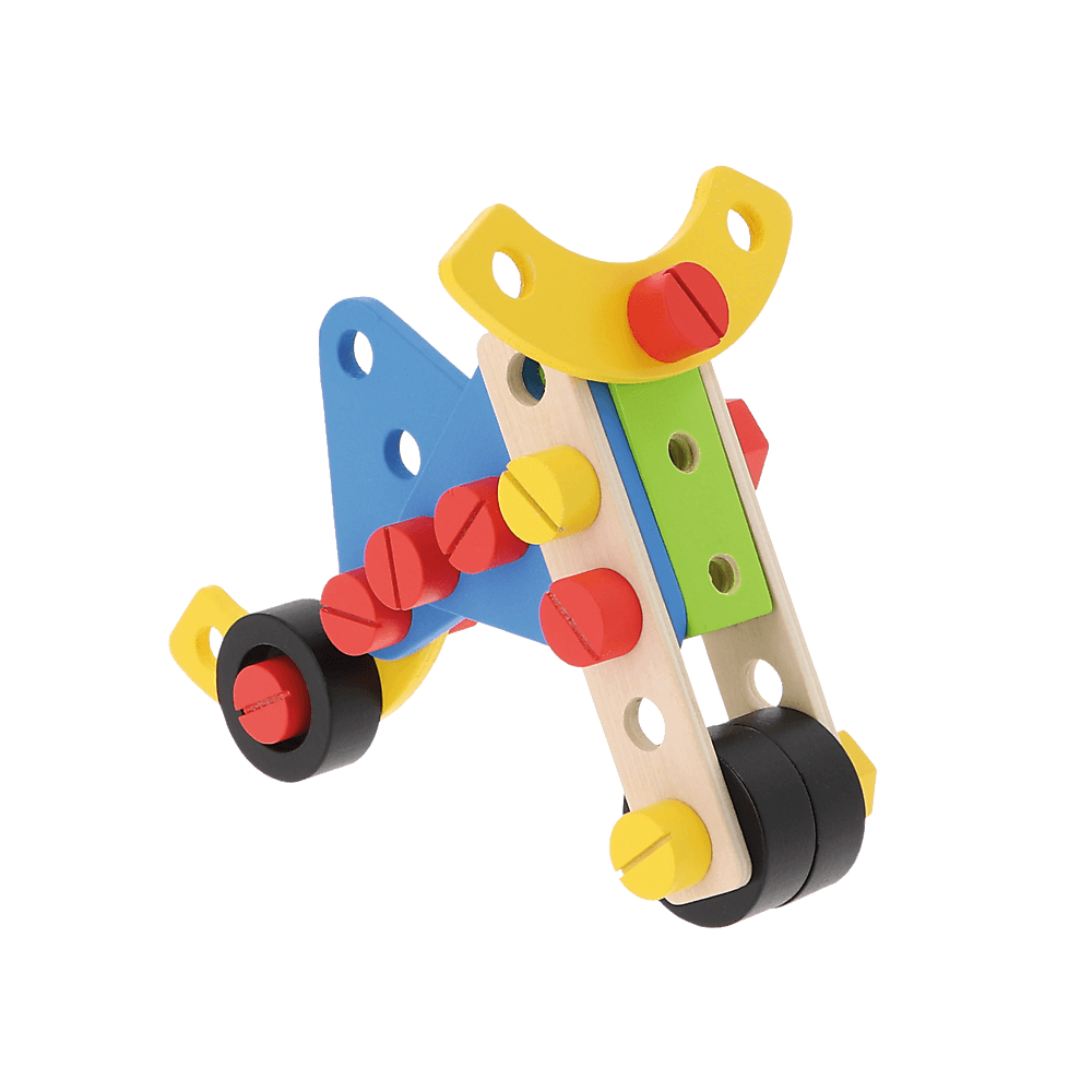 W zestawie 35 elementów: klocki, śrubki i narzędzia oraz manual z propozycjami złożenia wielu różnorodnych konstrukcji. Zabawka wspomaga rozwój motoryki małej, w szczególności ćwiczy nadgarstek dziecka. Zabawa pobudza wyobraźnię i kreatywność oraz ćwiczy koncentrację dziecka. Wszystkie materiały wykorzystane do stworzenia zabawki posiadają atesty, a także zostały pomalowane nietoksycznymi farbami. x