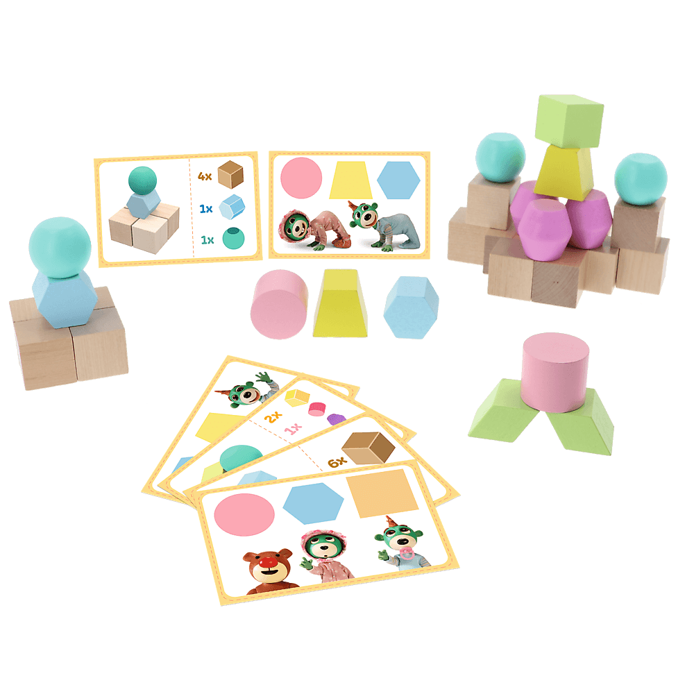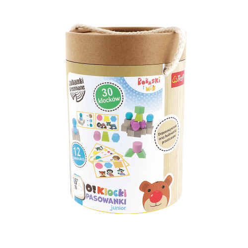 z kartami, stworzony we współpracy z psychologiem, z myślą o potrzebach najmłodszych. Dopasuj odpowiedni kształt klocka do obrazka znajdującego się na dużej karcie lub odwzoruj konstrukcję z karty w przestrzeni! 7 różnych kształtów klocków i aż 12 konfiguracji do ułożenia A na kartach nie kto inny jak postacie z ulubionego serialu Bobaski i Miś. Zabawka wspiera rozwój motoryki małej oraz koordynacji wzrokowo-ruchowej, a także rozwija wyobraźnię przestrzenną Połącz zestaw z innymi zestawami z serii O!Klocki i stwórz świat według własnej koncepcji. Wszystkie materiały wykorzystane do stworzenia zabawki posiadają atesty, a także zostały pomalowane nietoksycznymi farbami. x