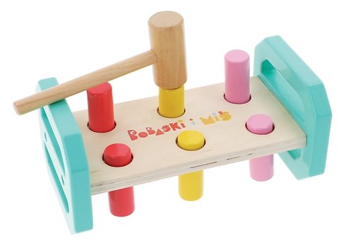 Stabilna deseczka wraz z małym młoteczkiem wykonane z naturalnego drewna to doskonała zabawka ogólnorozwojowa dla dzieci od 12 miesiąca życia. 6 pastelowych, grubych kołków oraz łatwy do chwytania młoteczek rozwijają sprawność