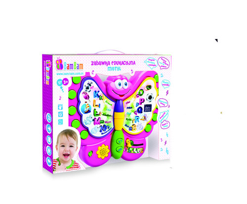 Muzyczny Motyl zabawka edukacyjna od 36 mca. Kolorowy motyl, z przekładanymi kartami pozwala na zmianę dźwięków liter bądź głosek wygrywanych na odpowiednich klawiszach, w zależności od rysunku na karcie. Dodatkowo przesuwanie suwaka pozwala na wybór opcji wygrywania liter, głosek, wymowy, lub całych wyrazów. Migoczące przyciski dodatkowo uatrakcyjniają zabawę. Zabawka stymuluje rozwój zmysłu słuchu, wzroku oraz rozwija zdolności manualne. Uczy literek, głosek oraz pełnych nazw przedmiotów, zwierząt bądź roślin.