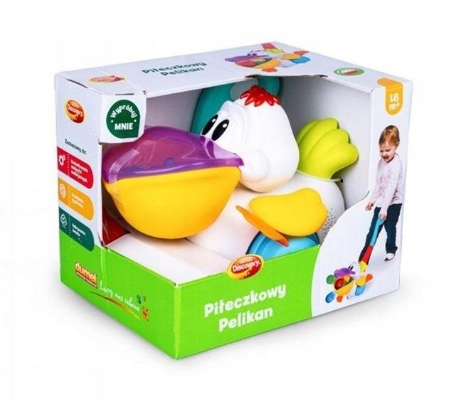 Zabawny pelikan z dziobem pełnym niespodzianek - piłeczek. Jeśli go delikatnie poprowadzisz, Pelikan będzie przebierał nóżkami i wydawał zabawne dźwięki. Pelikan podczas poruszania się wydaje zabawne i interesujące dźwięki, czuprynka świeci się na jasny kolor, skrzydełka i gumowe nóżki ruszają się, a z dzióbka wyskakują kolorowe, gumowe kuleczki. Zabawne dźwięki z pewnością wpłyną na wyobraźnię dziecka. Składana rączka ułatwi Maluszkowi zabawę pelikanem.