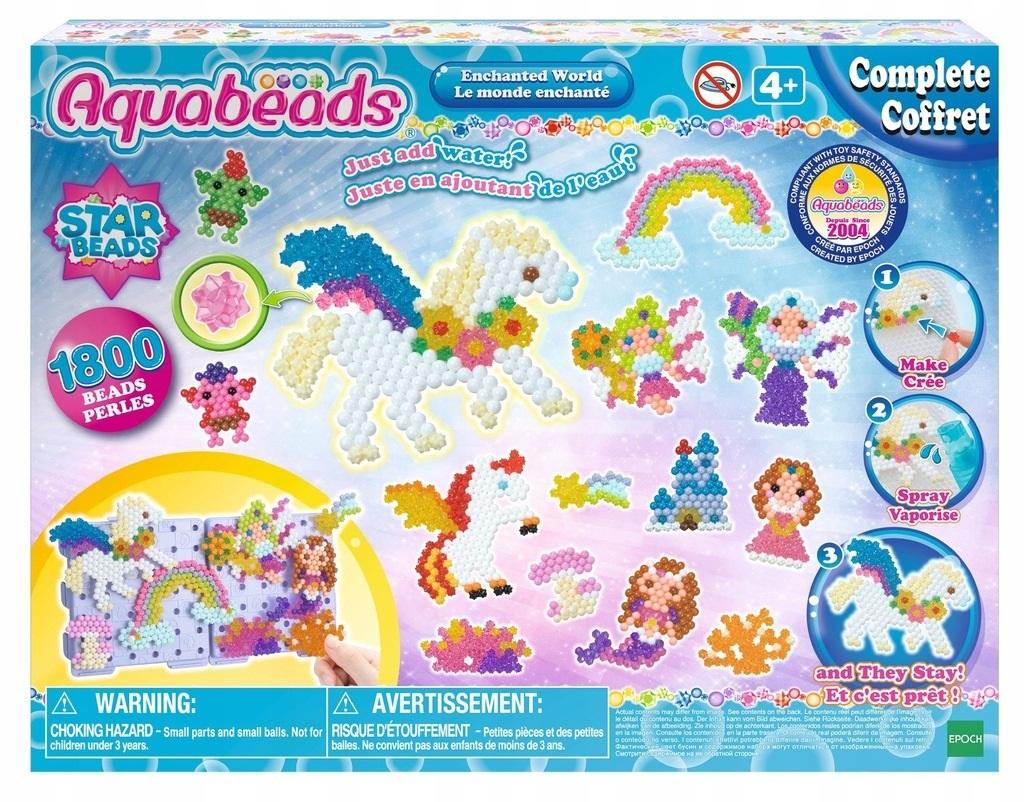 Zestaw koralików do zabaw kreatywnych Zaczarowany świat Aquabeads przeniesie nas do bajkowego, magicznego świata, w którym spotkamy jednorożce, czarodziejów, wróżki, małe skrzaty i wiele innych istot, które można stworzyć z kolorowych koralików. Po wyschnięciu koralikowe kreacje można przymocować do podstawki dekoracyjnej i stworzyć wyjątkową dekorację pokoju. Zestaw Zaczarowany świat Aquabeads zawiera 1500 kolorowych koralików, 2 stojaczki dekoracyjne, podkładkę do układania, spryskiwacz, scenerię oraz szablony. Oryginalne zabawki Aqubaeads od EPOCH zapewniają bezpieczną zabawę bez potrzeby użycia żelazka. Koraliki Aquabeads połączą się w magiczny sposób po spryskaniu wodą. Zabawki Aquabeads polecamy dla dzieci od 4 roku życia.