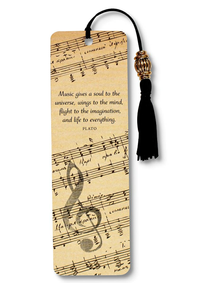 Zakładka do książki firmy Peter Pauper Press - Muzyka (Music). Cytat ``Music gives a soul to the universe, wings to the wind, flight to the imagination, and life to everything`` (Muzyka daje duszę wszechświatowi, skrzydła umysłowi, lot wyobraźni, a wszystkiemu życie) należy do Platona. Zakładka ma dopasowaną kolorystycznie wstążkę z frędzlem oraz koralik. Barwne, trwałe, zabawne lub motywujące nadruki sprawią, że czytanie będzie jeszcze ciekawsze. Każda zakładka jest drukowana na trwałym, powlekanym kartonie i pakowana w przezroczystą osłonkę. Uniwersalny wymiar 6,4 x 18,1 cm.