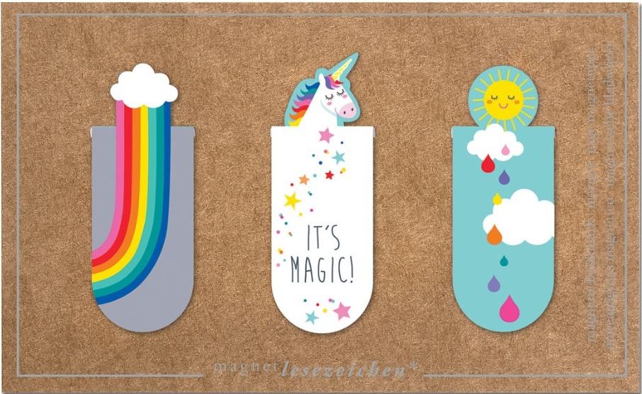Zakładki magnetyczne - Jednorożec. Pięknie ilustrowane zakładki z wystającymi, ozdobnymi elementami. Idealne do zaznaczania ostatnio czytanych lub ulubionych fragmentów książek. Doskonale sprawdzają się w indeksowaniu notatek, dokumentów w biurze, w szkole i w domu. Każdy zestaw zawiera 3 zakładki o różnych wzorach, skoordynowanych tematycznie.