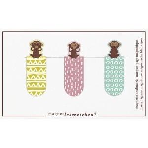 Zakładki Magnetyczne - Małpki. Pięknie ilustrowane zakładki z wystającymi, ozdobnymi elementami. Idealne do zaznaczania ostatnio czytanych lub ulubionych fragmentów książek. Doskonale sprawdzają się w indeksowaniu notatek, dokumentów w biurze, w szkole i w domu. Każdy zestaw zawiera 3 zakładki o różnych wzorach, skoordynowanych tematycznie.