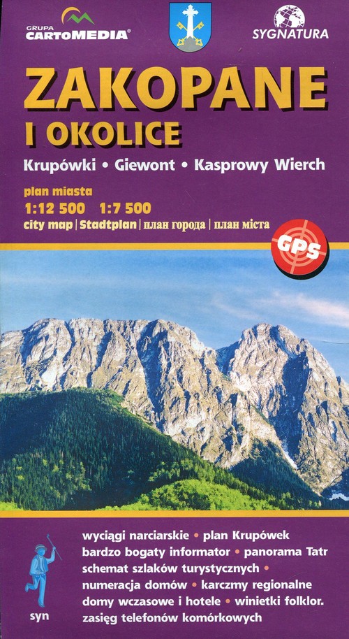 Plan Zakopanego w skali 1:12 500. Narysowano w nim praktycznie wszystkie budynki. uliczki i najmniejsze ścieżki. Legenda obejmuje wszystkie informacje. jakie mogą być potrzebne turyście odwiedzającemu miasto. Plan główny. oprócz Zakopanego obejmuje także część Kościeliska. Zębu i Murzasichla. Najważniejsza ulica miasta. Krupówki. zyskała plan w bardzo dużej skali 1:7 500. Na odwrocie zamieszczono dokładną mapę południowej części Zakopanego. położonej już w Tatrach. Mapa ta pokazuje m.in. otoczenie Kasprowego Wierchu i Giewontu. Legenda planu zawiera około 80 znaków. objaśnionych w 4 językach. Na planie są zaznaczone m.in. ścieżki rowerowe. trasy i wyciągi narciarskie oraz szlaki turystyczne. Można znaleźć karczmy regionalne i galerie. Jest pełna baza noclegowa. są pokazane wszystkie hotele i pensjonaty. także sanatoria i campingi. Na uwagę zasługuje numeracja domów. niezwykle ułatwiająca poruszanie się w gąszczu miasta. Winietki folklorystyczne uatrakcyjniają plan.