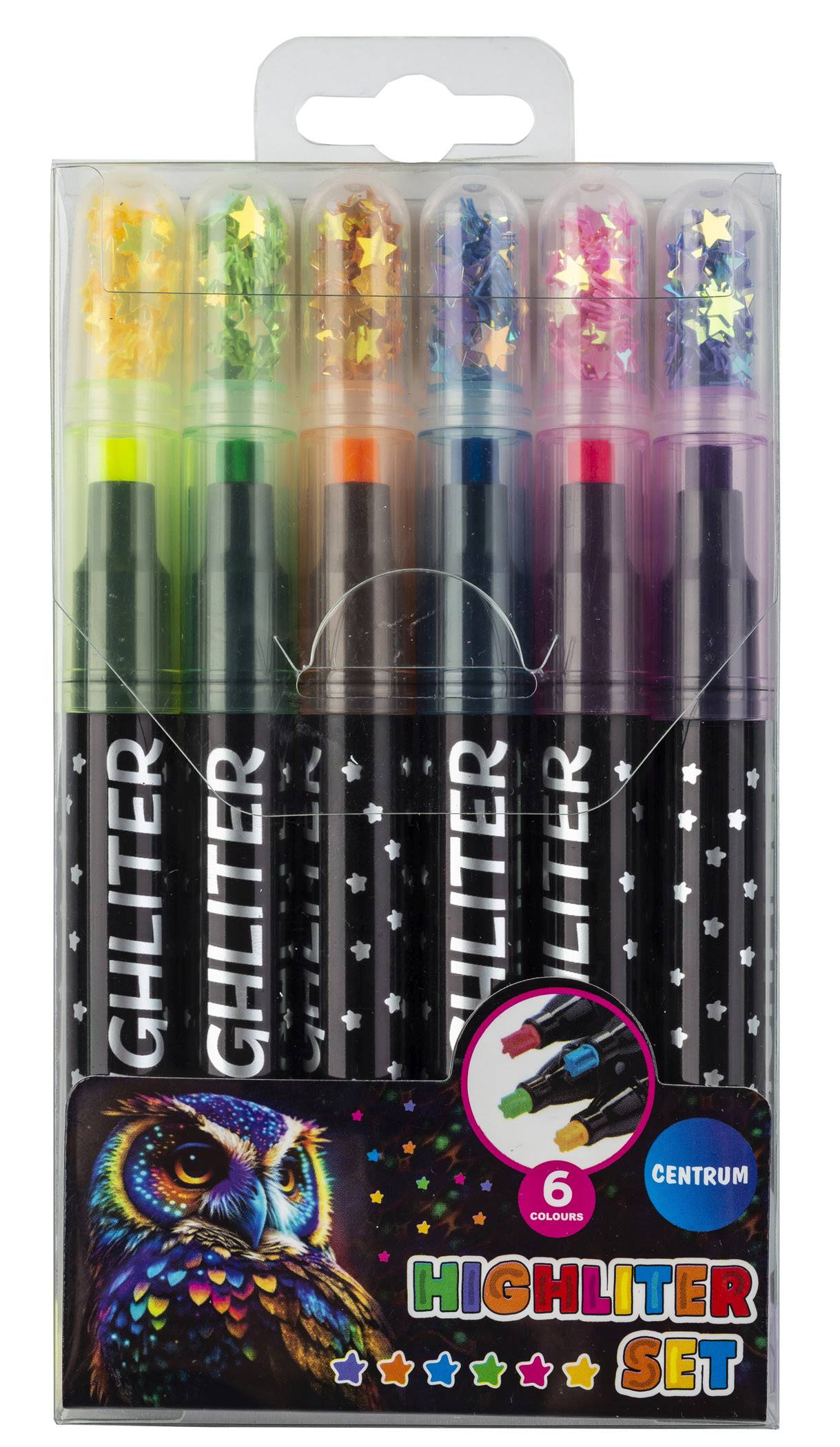 Opis produktuZasady bezpieczeństwaZakreślacz Gwiazdki 6 kolorów 6 kolorów zakreślacza, skuwka z zawartością gwiazdek do rozsypywania x