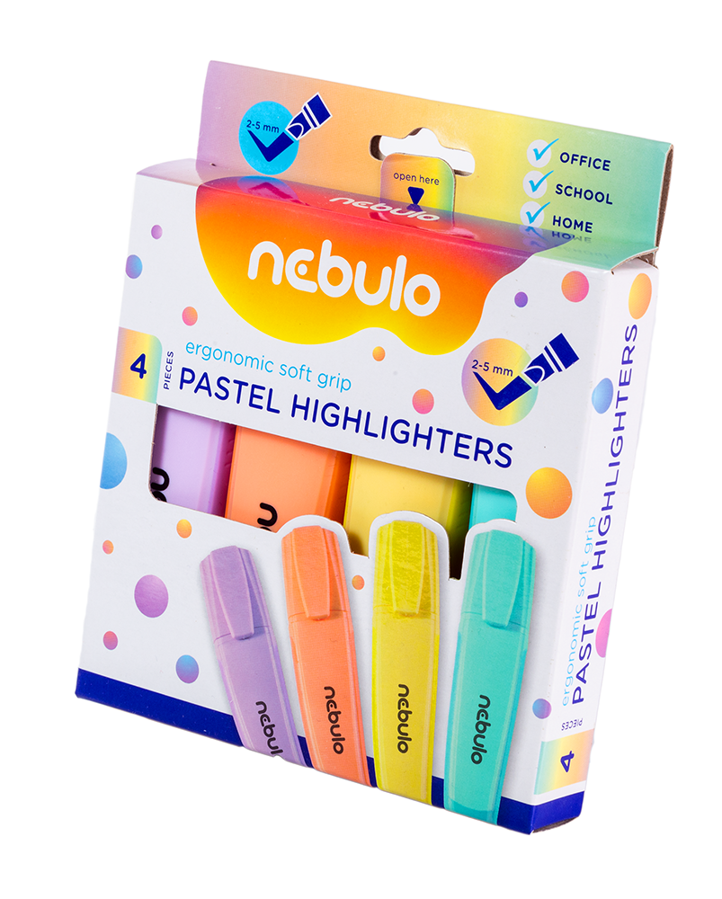 Zestaw pastelowych zakreślaczy z ergonomicznym uchwytem w kolorach żółtym, niebieskim, fioletowym i pomarańczowym.