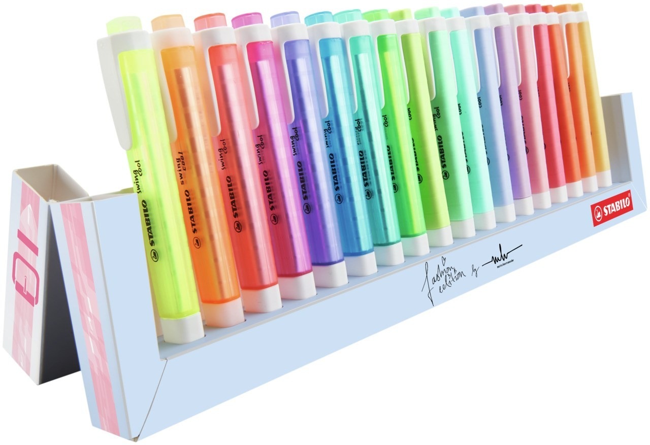 STABILO swing cool + swing cool Pastel deskset 18 szt. to wyjątkowa propozycja - edycja Fashion inspirowana pracą austriackiej projektanki mody - Mariny Hoermanseder. Praktyczny zestaw na biurko zawiera aż 18 zakreślaczy: 8 kolorów neonowych i 10 pastelowych. Podstawka oraz opakowanie zrobione są z mocnego