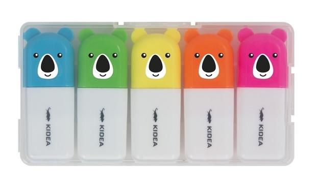 Zestaw fluo mini zakreślaczy z wesołymi główkami. 5 słodkich misi z uszkami to 5 kolorów - niebieski, zielony, żółty, pomarańczowy i różowy.