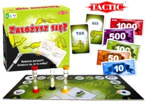 Opis produktuZasady bezpieczeństwaZałożysz się?W tej zabawnej grze rodzinnej wykonujesz różne zadania lub odpowiadasz na pytania. Inne osoby obstawiają twój sukces lub porażkę. Jeśli odgadną, wygrywają podwójną wartość obstawionych punktów. Twój sukces to także ekstra punkty dla ciebie!Założysz się? dzięki swojej interaktywności i zabawnym zadaniom wciąga tak dorosłych jak i dzieci. To gra zarówno na długie wieczory w rodzinnym gronie jak i na szaloną imprezę! Zawartość gry Założysz się?1 plansza, 288 kart zadań (144 zręcznościowych, 144 umysłowych), 12 kart TAK/NIE Talia banknotów , 6 pionków, 1 notatnik, 1 kostka, 3 klepsydryPrzeznaczenieGra przeznaczona dla 3 - 6 graczy w wieku 7+Zasady gry w skrócieGracze otrzymują banknoty o wartości 80 punktów. • Jeśli gracz pomyślnie wykonał zadanie, otrzymuje tyle pieniędzy, ile łącznie (obstawiając) wyłożyli inni zawodnicy. Pole z zadaniem zręcznościowym Zakład w ciemno Kości zostały rzucone Pole startowe Pole ze strzałką i Pole startowe Video do gry Założysz się?x