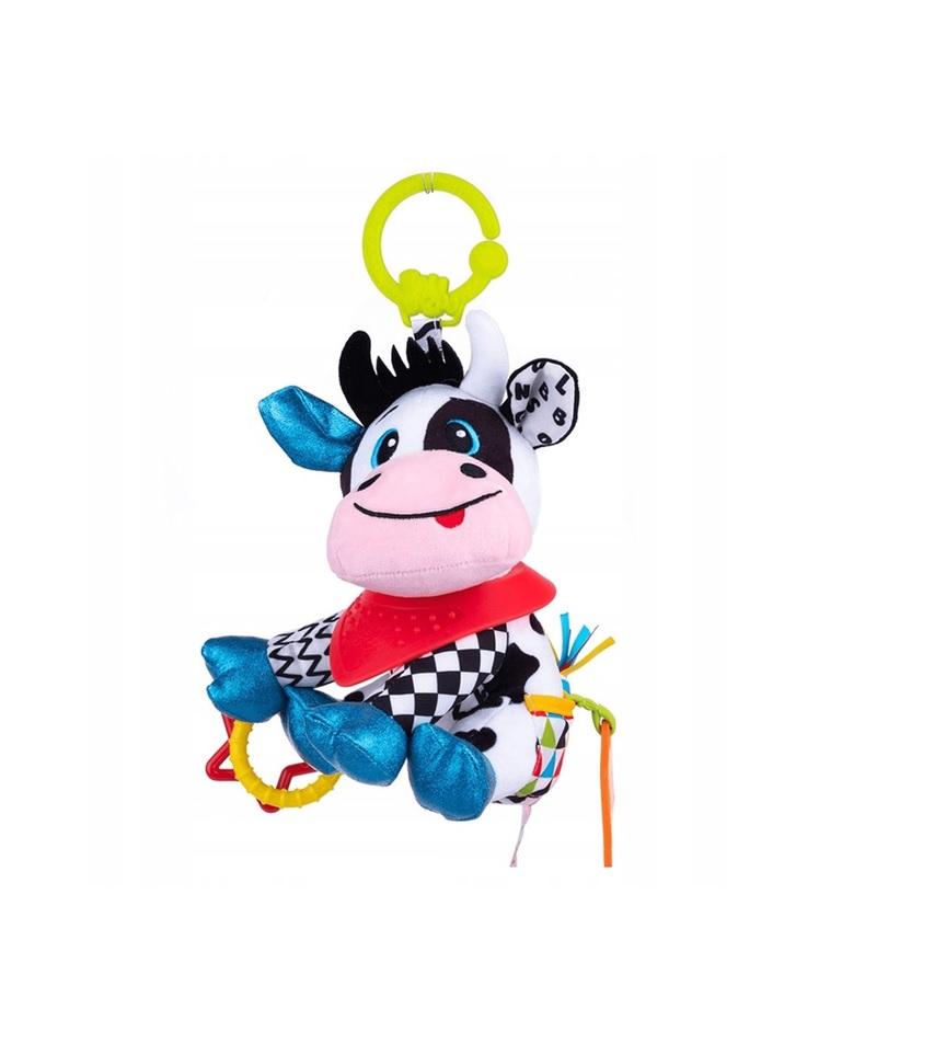 Opis produktuZasady bezpieczeństwaMatylda to urocza krówka, która posiada wspaniały wzrok. Wszystko za sprawą kontrastowych wzorów, zdobiących jej futerko. Krówka stymuluje zmysł wzroku malucha, a dzięki zróżnicowanym fakturom materiałów, z których została wykonana, pozwala najmłodszym rozwijać także zmysł dotyku. Matylda posiada kolorowe gryzaczki, w tym bandankę z wypustkami, oraz praktyczny uchwyt umożliwiający przymocowanie zabawki w dowolnym miejscu. Zabawka przeznaczona jest dla dzieci od dnia narodzin. Cechy zabawki: - praktyczna zawieszka do mocowania zabawki w dowolnym miejscu - zróżnicowane faktury materiałów - szeleszczące elementy (uszy) - gryzaki doczepione do zabawki (w tym 2 miękkie - listek i bandana z wypustkami) - wiek: 0+ x