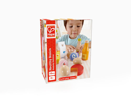 Jeśli chcesz odpowiednio edukować Twoje dziecko już od jego najmłodszych lat, pokazywać mu dobre wzorce i uczyć zdrowych nawyków, istnieje zabawka, która może Ci w tym pomóc. Zestaw Hape zdrowa żywność to podstawowa gama produktów dla każdego zdrowo jedzącego malucha. Elementy są w całości wykonane z drewna, bezpieczne i trwałe. Dodatkowo pięknie wykończone i pomalowana farbami opartymi na bazie wody. Produkt ten przeznaczony jest dla dzieci od 3 roku życia. Zestaw zawiera: Butelkę soku jabłkowego praz pomarańczowego, duży karton mleka, ser żółty, pudełeczko jogurtu, trzy jajka, kartonik soku pomarańczowego z rurką oraz pudełeczko dżemu jagodowego. Na ich podstawie każdy mały mistrz kuchni będzie mógł stworzyć różnego rodzaju zdrowe posiłki, jednocześnie ucząc się odpowiednich nawyków żywieniowych.