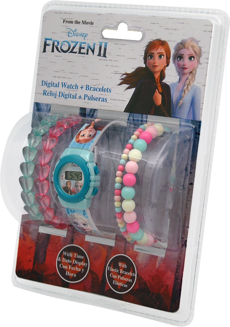 Kraina Lodu 2, Zegarek Elektroniczny Plus Zestaw Bransoletek. Zegarek elektroniczny z wizerunkami sióstr Elsy i Anny. Zegarek posiada tarczę elektronicznąoraz mechanizm kwarcowy zasilany pojedynczą baterią. Zestaw składa się z cyfrowego zegarka z regulacją i 4 różnych bransoletek na gumce. Zaprojektowany bardzo starannie z wzorem z kultowej bajki ""Kraina Lodu 2"". Zestaw idealny na prezent. Wymiary: średnica tarczy - 3 cm, długość paska - 22 cm. UWAGA: Zawiera małe elementy, których połknięcie grozi niebezpieczeństwem.