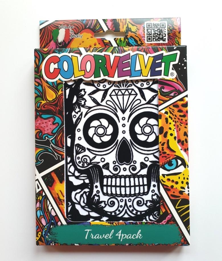 Zestaw 4 kolorowanek welwetowych, każda o wymiarze 18x12 cm, z 12 flamastrami Carioca w zestawie - idealny towarzysz podróży.
