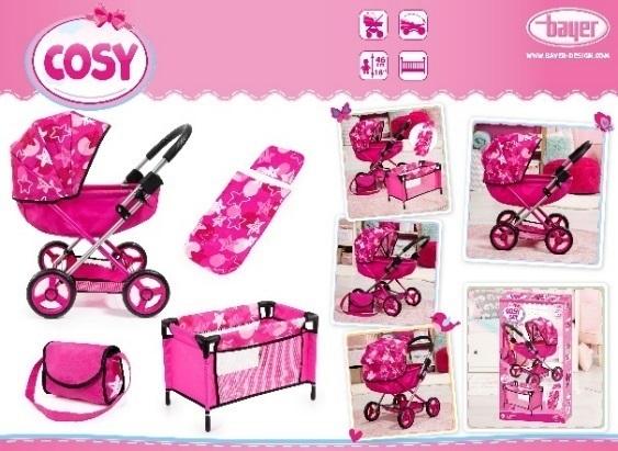Opis produktuZasady bezpieczeństwaZestaw akcesoriów dla lalek skladajacy sie z: wózka dla lalek Cosy (wraz z poduszka i kocykiem), lózeczka dla lalki oraz praktycznej torby na ramie. Wózek dla lalek COSY posiada piekny design, a dzieki przytulnemu kocykowi i dopasowanej poduszce zapewni lalce spokojne i slodkie sny. W wózku zmieszcza sie lalki o wysokosci do 46 cm. Dwukolorowa rama z nowoczesnymi kolami pasujacymi do koloru i olsniewajaca oslona przeciw sloncu nadaja wózkowi przepiekny wyglad. Dzieki duzym oponom wózek dla lalek COSY jest latwy w prowadzeniu nawet po bardzo nierównym terenie. Dodatkowo wózek mozna prosto zlozyc, pomaga to w transporcie Ponadto zintegrowany kosz zapewnia wiele miejsca do przechowywania wszystkiego, czego potrzebujesz. Dzieki poduszce i kocykowi lalka Handle height (cm): 58, Measurements (cm): 63 x 34 x 58 x