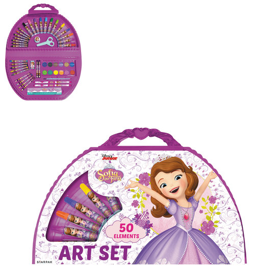 Zestaw przyborów szkolnych z kolekcji Starpak z licencją Sofia the First dla małych artystów pomagający rozwijać im kreatywność i poznawać nowe techniki malarskie. Składa się z 50 elementów: 12 pisaków, 12 kredek woskowych oraz 6 kredek ołówkowych, 12 farb akwarelowych, pędzla, temperówki, 2 ołówków, gumki do mazania, linijki, palety do malowania i nożyczek. Wszystkie elementy zestawu zostały wykonane z wysokiej jakości materiałów co zapewni długie użytkowanie. Cały zestaw jest zorganizowany w jednej, zamykanej walizeczce z rączką, ułatwiającej przechowywanie i przenoszenie. Zapoznaj się również z innymi produktami Starpak z serii Sofia the First! Produkt przeznaczony dla dzieci w wieku: 3+. Wymiary produktu(wys.x szer. x gł.) [cm]: 30x19x3.