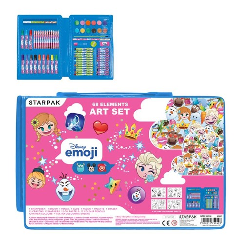 Wspaniały zestaw dla małych artystów pomagający rozwijać im kreatywność i poznawać nowe techniki malarskie. Składa się z 68 elementów: 12 pisaków, 12 kredek woskowych oraz 12 kredek ołówkowych, 12 pasteli, 12 farb akwarelowych, pędzla, temperówki, ołówka, gumki do mazania, kleju, linijki, palety do malowania i 4 kartek ze szkicem do kolorowania. Wszystkie elementy zestawu są wykonane z wysokiej jakości materiałów co zapewni długie użytkowanie. Cały zestaw jest zorganizowany w jednej, zamykanej walizeczce z rączką, ułatwiającej przechowywanie i przenoszenie. Walizka zdobiona jest nadrukiem Emoji Frozen.