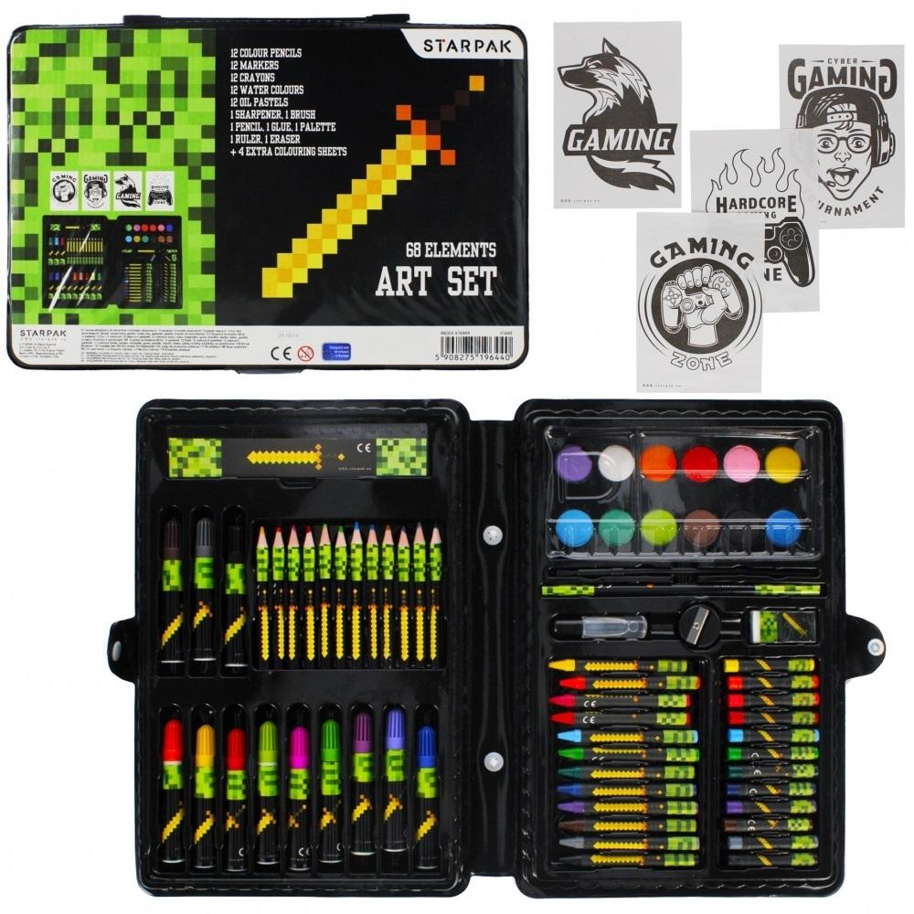 Opis produktuZasady bezpieczeństwaZestaw przyborów szkolnych z kolekcji Starpak z licencją Pixel games dla małych artystów pomagający rozwijać im kreatywność i poznawać nowe techniki malarskie. Zestaw składa się z 68 elementów: 12 pisaków, 12 kredek woskowych oraz 12 kredek ołówkowych, 12 pasteli, 12 farb akwarelowych, pędzla, temperówki, ołówka, gumki do mazania, kleju, linijki, palety do malowania i 4 kartek ze szkicem do kolorowania. Wszystkie elementy zestawu są wykonane z wysokiej jakości materiałów co zapewni długie użytkowanie. Cały zestaw jest zorganizowany w jednej, zamykanej walizeczce z rączką, ułatwiającej przechowywanie i przenoszenie. Zapoznaj się również z innymi produktami Starpak z serii Pixel games! Produkt przeznaczony dla dzieci w wieku: 3+. x