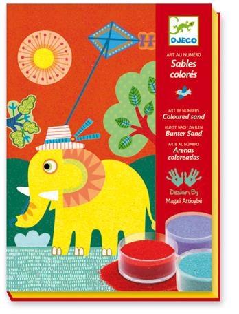 Zestaw artystyczny do malowania piaskiem. 4 tablice tekturowe z naszkicowanym rysunkiem. Każdy element jest ponumerowany i pokryty klejem zabezpieczonym taśmą przezroczystą. Dziecko odrywa fragment ""naklejki"" i posypuje kolorowym piaskiem. Piasek przykleja się a jego nadmiar zsypujemy z powrotem do pojemniczka i odklejamy następny kawałek... Do podważania naklejki służy specjalny rysik, dołączony do zestawu. Dzięki pomysłowym rozwiązaniom (piasek sypiemy nad tekturowym pudełkiem z otworkiem na roku) bałagan będzie minimalny, a końcowy efekt zachwycającyZestaw zawiera:4 pokryte klejem i zabezpieczone folią karty12 pojemniczków z kolorowym piaskiem1 patyczek - narzędzie do łatwego odrywania naklejek i nadawania kształtu1 książeczka z instrukcją krok po krokuWiek: 4 +Wymiary pudełka: 16,5 x 23 x 4 cm