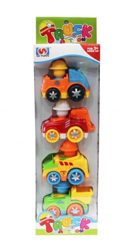 W zestawie 4 różne wzory autek, m.in. koparka i wywrotka. Pojazdy z napędem frykcyjnym - wystarczy popchnąć je do przodu, a zabawka sama zacznie jechać. x