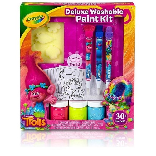 Zestaw Deluxe ze zmywalnymi farbami zawiera wszystko co potrzebne do kolorowania scen z filmu Trolle. Wybierz pędzel oraz postać i pokoloruj obrazek! W zestawie znajduje się podwójnie zakończony pędzel, który pozwala na tworzenie wielu stylów malowania.
