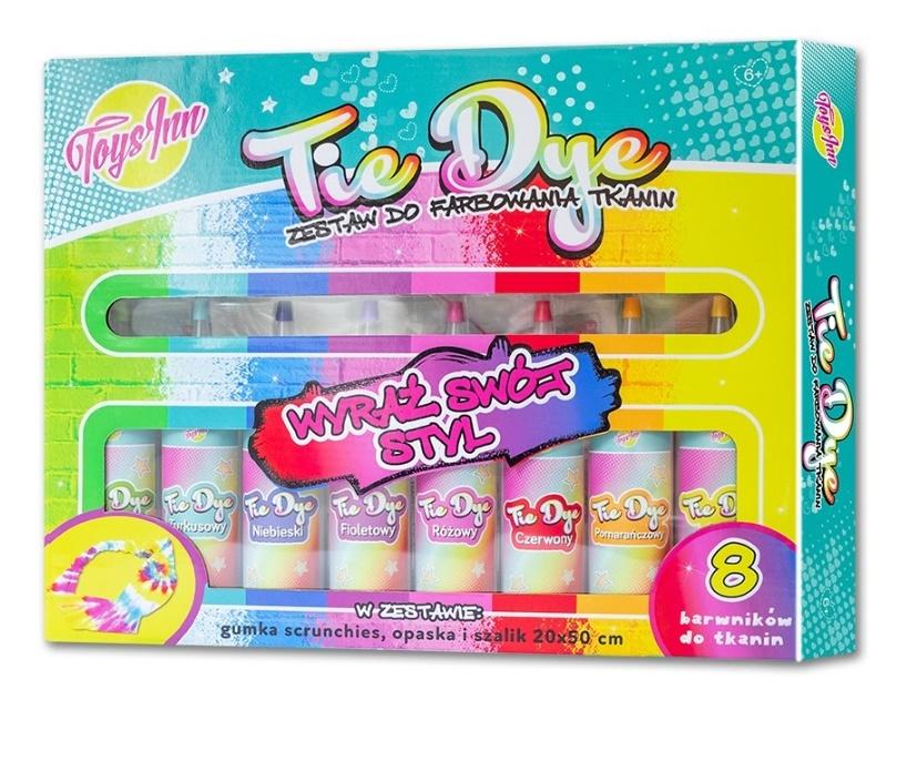Opis produktuZasady bezpieczeństwaWyraź swój styl, baw się kolorami i stwórz niepowtarzalną apaszkę lub ozdób własną koszulkę. Zestaw zawiera 8 butelek z barwnikiem do tkanin po 5,2 g (żółty, pomarańczowy, czerwony, różowy, fioletowy, niebieski, turkusowy, zielony), bawełnianą, białą apaszkę 20x50cm, opaskę na włosy, gumkę scrunchies, rękawiczki - 3 pary, obrus 91x91 cm, gumki - 30 szt, instrukcję. x