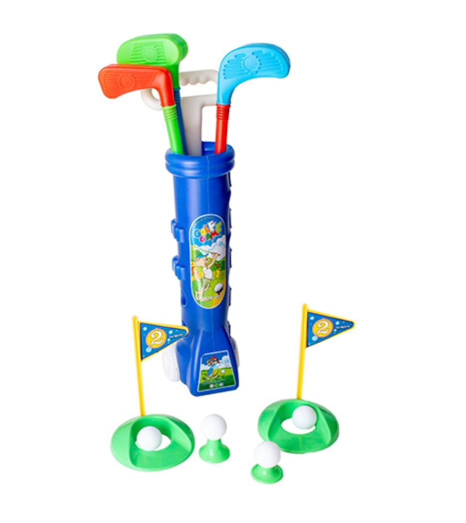 wózek golfowy 3 kije golfowe o długości 56 cm 2 dołki z chorągiewką 4 piłeczki 2 podstawki do piłeczek o różnej wysokości x