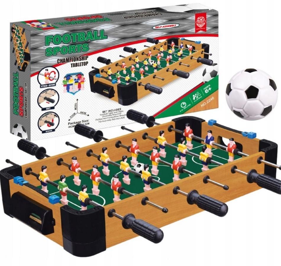 Opis produktuZasady bezpieczeństwaFantastyczny zestaw do gry w piłkarzyki zapewni mnóstwo emocji i radości podczas rozgrywki. Gra dla 2 osób będzie idealną atrakcją podczas spotkań z przyjaciółmi lub rodziną. Wciągająca oraz emocjonująca gra wciągnie i zachęci do zabawy nie tylko dzieci, ale także dorosłych. Każdy gracz ma swoją drużynę piłkarzyków, którą przesuwa za pomocą antypoślizgowych rączek odpowiedzialnych za wybrany szereg piłkarzy. Piłkarze z każdej dużyny umieszczeni są na 3 metalowych prętach. Gdy drużyna strzeli gola, należy przesunąć punkt na swojej tabeli punktacji, która znajduje się nad bramką, po dwóch stronach stołu. Przenośna gra w piłkarzyki jest w idealnym rozmiarze, oszczędzającym miejsce w każdym pomieszczeniu, np. w pokoju dziecka. Gra pomoże rozwinąć u dzieci zręczność oraz koncentrację, a także nauczy rywalizacji w grach i zabawach drużynowych. Dziecko ćwiczy także swoją cierpliwość oraz koordynację wzrokowo-ruchową. Zestaw zawiera: 18 piłkarzy, piłkę do gry, stół z boiskiem do gry Zestaw zachwyci każdego małego kibica i zapewni wiele godzin niesamowitej rozrywki. Gra ta będzie świetnym prezentem dla każdego miłośnika piłki nożnej. Wymiary opakowania:46x25,5x7cm x