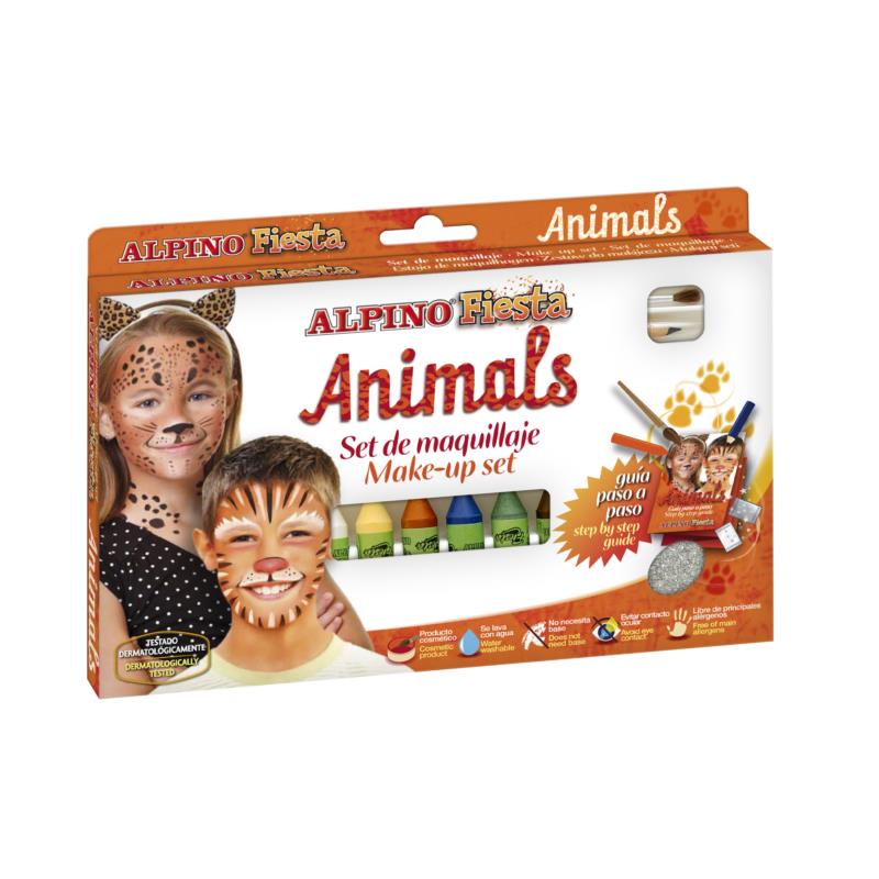 Kompletny zestaw do makijażu, w skład którego wchodzi 6 kredek, dwie torebki brokatu, tatuaże, kredka do oczu i pędzelek. Zamień się w zwierzaka.