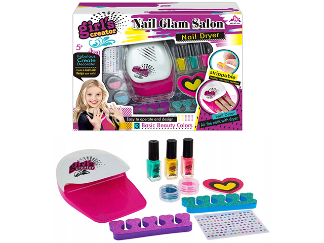 2 separatory do stóp, pilniczek do paznokci w kształcie serca, 3 lakiery do paznokci (usuwanie bez użycia zmywacza) dekoracyjne naklejki na paznokcie, 2 kolory brokatu suszarka do paznokci z wentylatorkiem (zasilana na baterie)