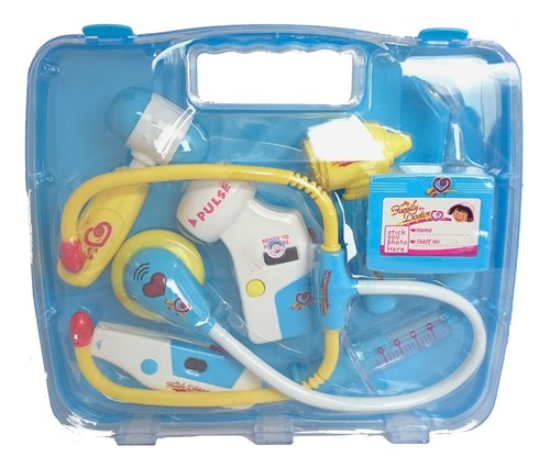 Plastikowa walizeczka z akcesoriami niezbędnymi do zabawy w lekarza.