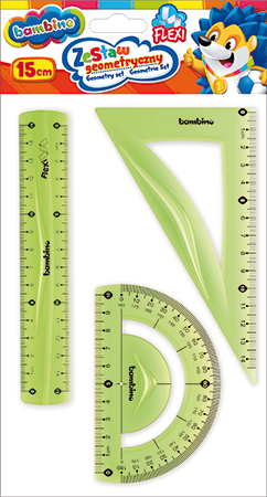 Zestaw przydatny w szkole, w szczególności na zajęciach matematycznych. W skład zestawu wchodzą: linijka, ekierka, kątomierz. Produkty zostały wykonane ze specjalnego materiału odpornego na złamanie.